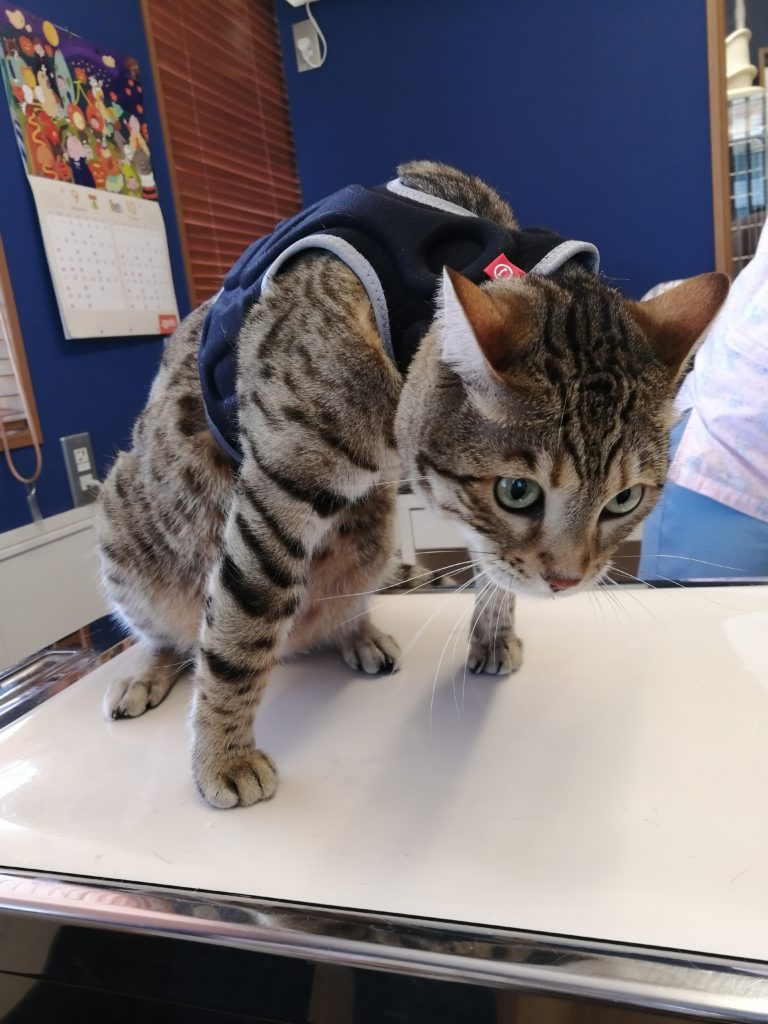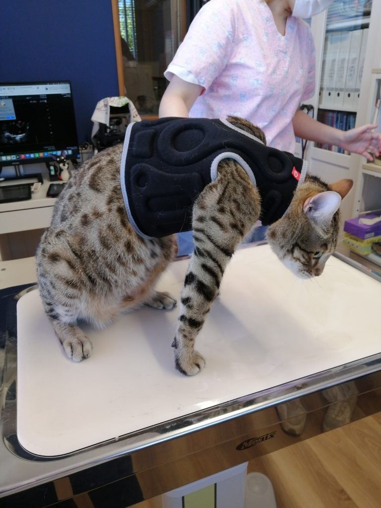 『にゃんケアチョッキ』とは首と胸周りを包み込むことで猫の動きがピタリと止まる不思議なチョッキのこと🦺