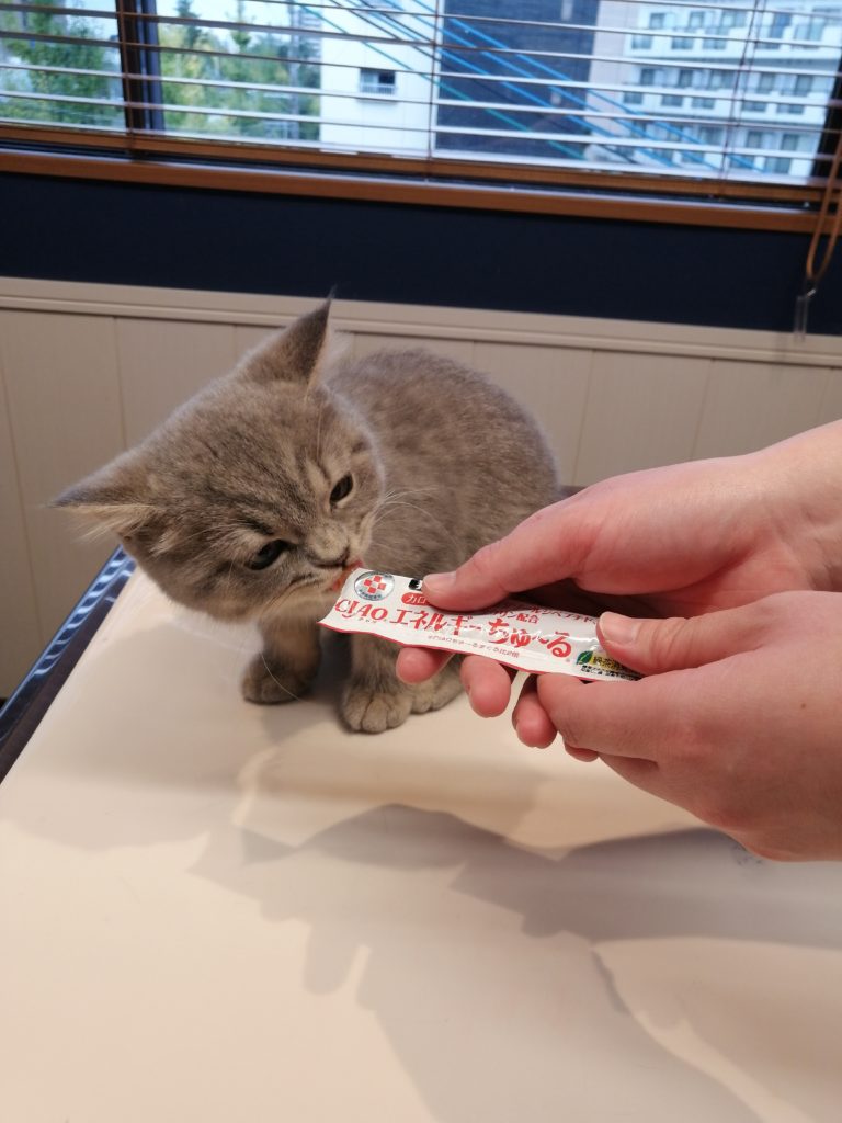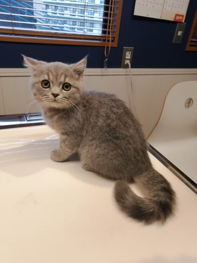 【子猫のそら君🐾】 2025年11月12日 診療日誌 以前から来院されている飼い主様が新たに子猫ちゃんを連れて来院されました❢ ブリティッシュ・ショートヘアーの男の子💞 まだ3ヶ月齢です🤗 ブリティッシュ・ショートヘアーは薄いグレー1色だけかと思っていましたが、そら君にはシッポや顔、腕に縞々模様が入っております😳 初めての病院なのにドンと構えて落ち着いていました。 大物になる予感🤭 この日、生まれて初めてのちゅーる解禁をして、ちゅーるの美味しさに目覚めたようです❢
