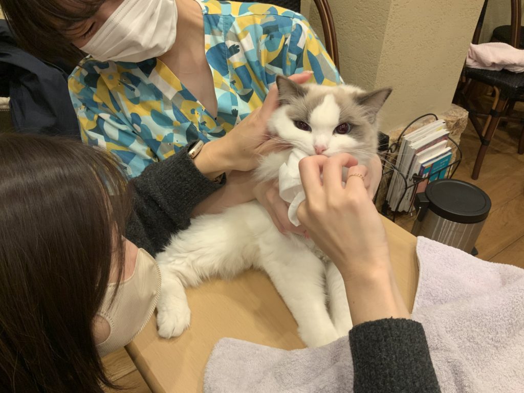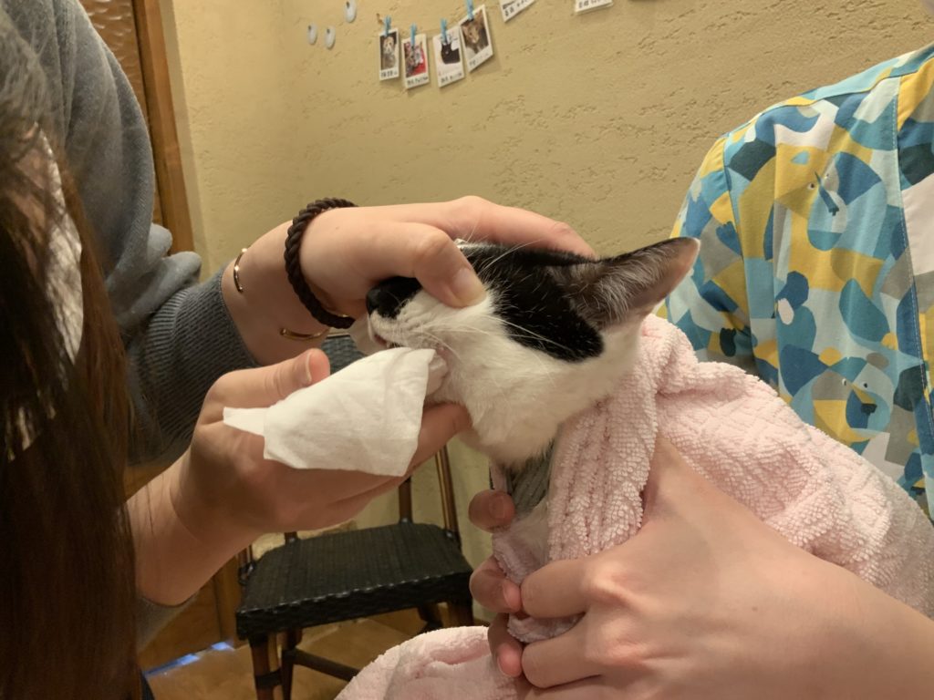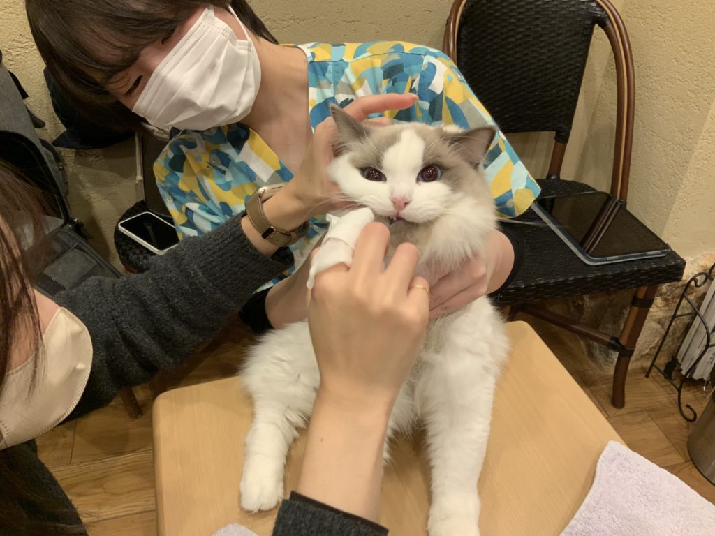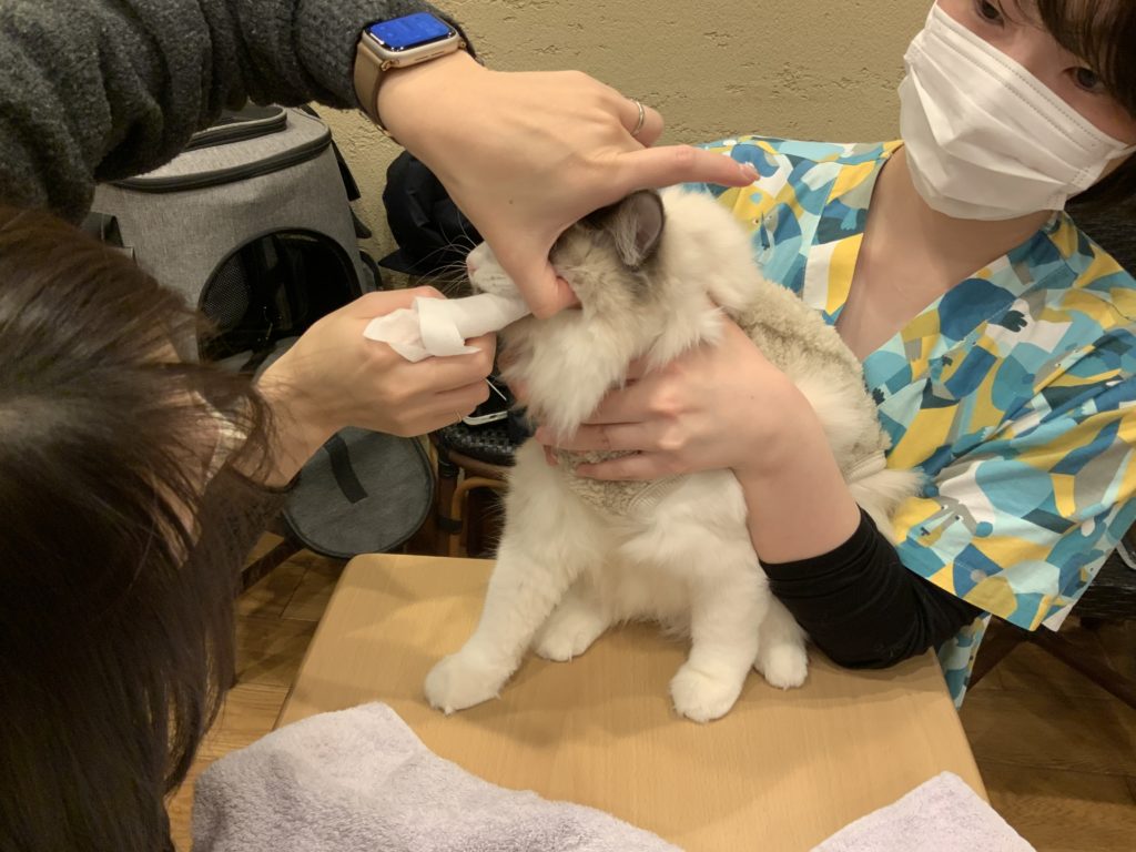 お口の中に指が入ることには慣れてくれていたので、デンタルシートを巻いた指が入ってきてもすぐに受け入れてくれました。