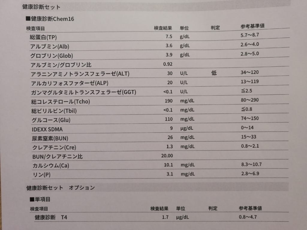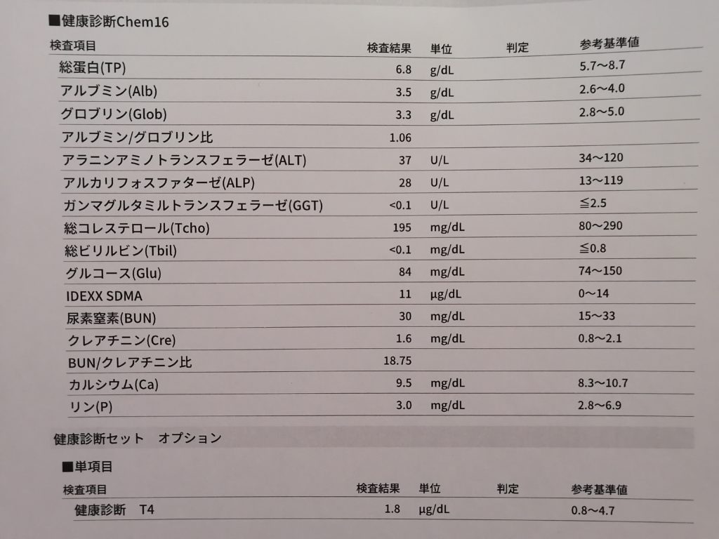 さて今回の健康診断は2匹ともシニア向けの内容で受けてみましたが、結果はこうでした〜!